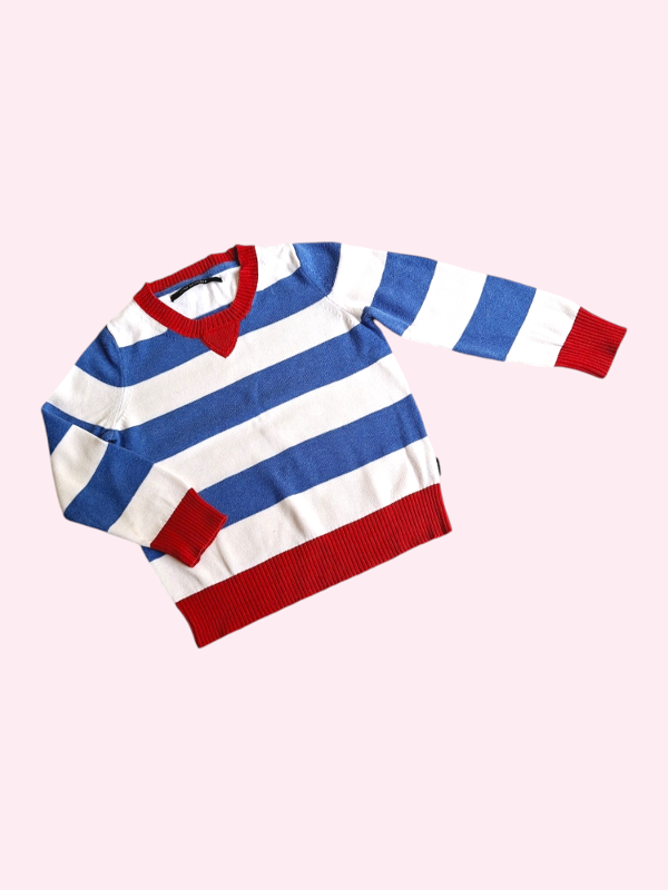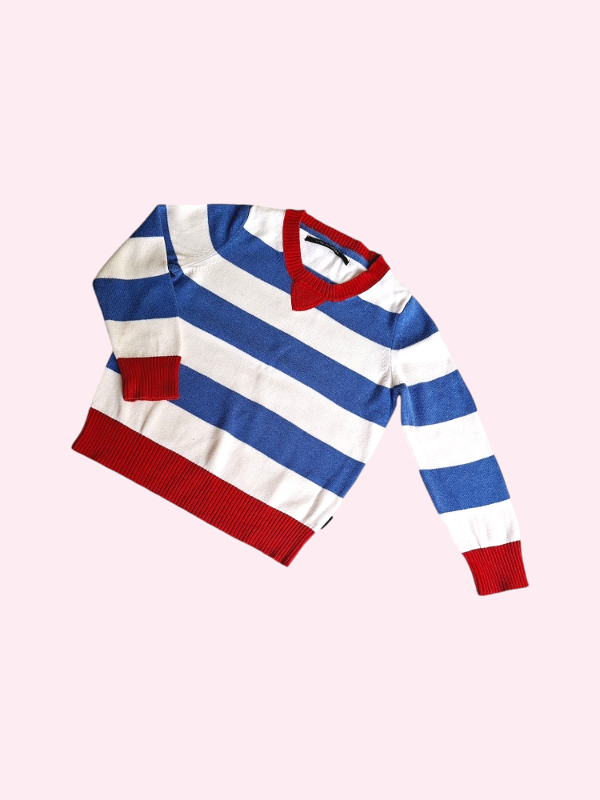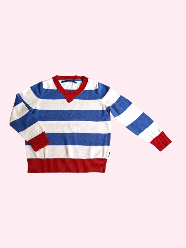 Sweater de hilo rayado celeste y blanco con detalles en rojo Akiabara 2 años